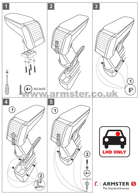 When not in use, the armrest can be tilted upright a full 90 degrees between the front seats. The Armster armrest is a very comfortable addition, whatever model of vehicle you drive, and there are currently over 300 Armster kits available including the premium quality Armster 2 version available from our other listings. For Left Hand Drive vehicles only.